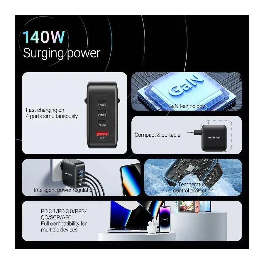 CARGADOR DE PARED VENTION GAN 3XUSB-C USB -A 140W BLACK + CABLE USB-C