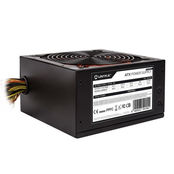 Fuente de alimentación ATX 700W con ventilador rojo de 14 cm ultra-silencioso. Incluye protección de seguridad contra sobre tensión, caídas de tensión, sobre intensidad y cortocircuitos. Incorpora corrector de potencia (PFC), que regula el voltaje de entrada, para una conversión estable y eï¬ciente, compensando las ï¬?uctuaciones del suministro eléctrico.