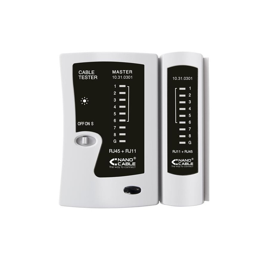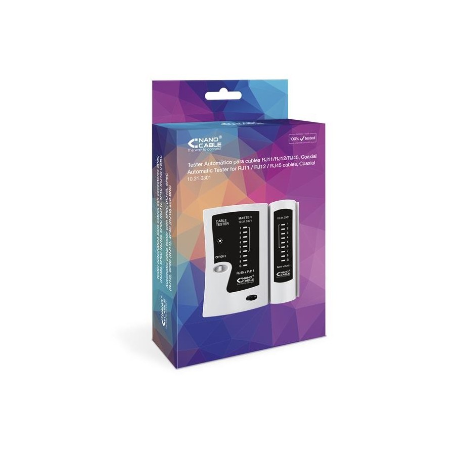 Nanocable 10.31.0301. Longitud del paquete: 3 cm, Ancho del paquete: 110 mm, Altura del paquete: 185 mm. Cantidad por palé: 50 pieza(s), Peso del envase completo: 9,5 kg, Cantidad por caja: 1500 pieza(s) - Testeador automatico para cable RJ11 / RJ12 / RJ45\n- Incluye funda de protección con cremallera