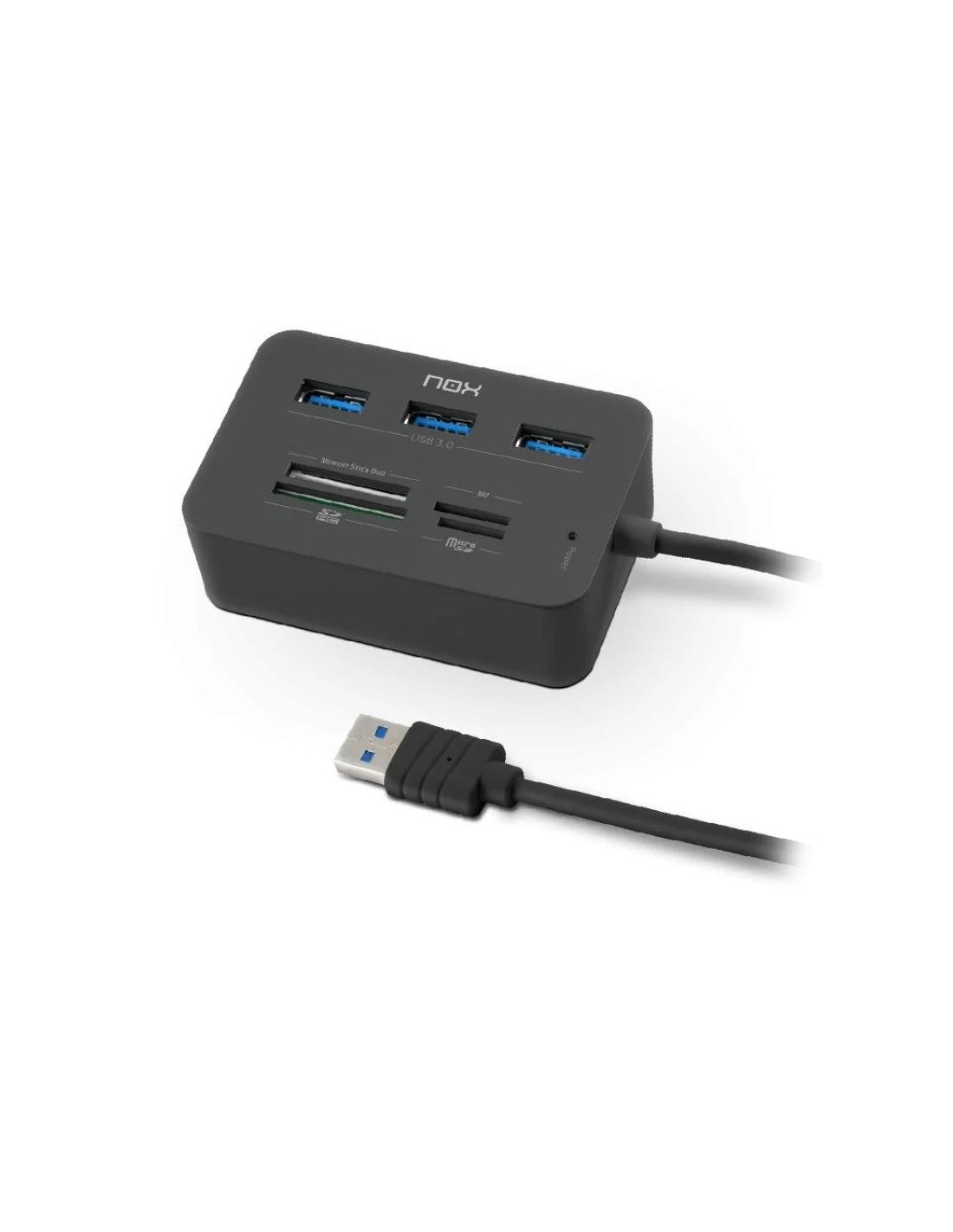 - Completo Hub Multilector. Este versátil accesorio de Nox es compatible con las principales tarjetas de memoria: SD/SDHC, M2 y Micro SD. De igual modo, el Nox Lite Reader One posee una gran capacidad, contando también con 3 puertos USB 3.0 para conectar periféricos como un ratón, teclado o auriculares, además de impresoras, teléfonos móviles, discos duros externos u otros dispositivos que podrán funcionar de manera simultánea.