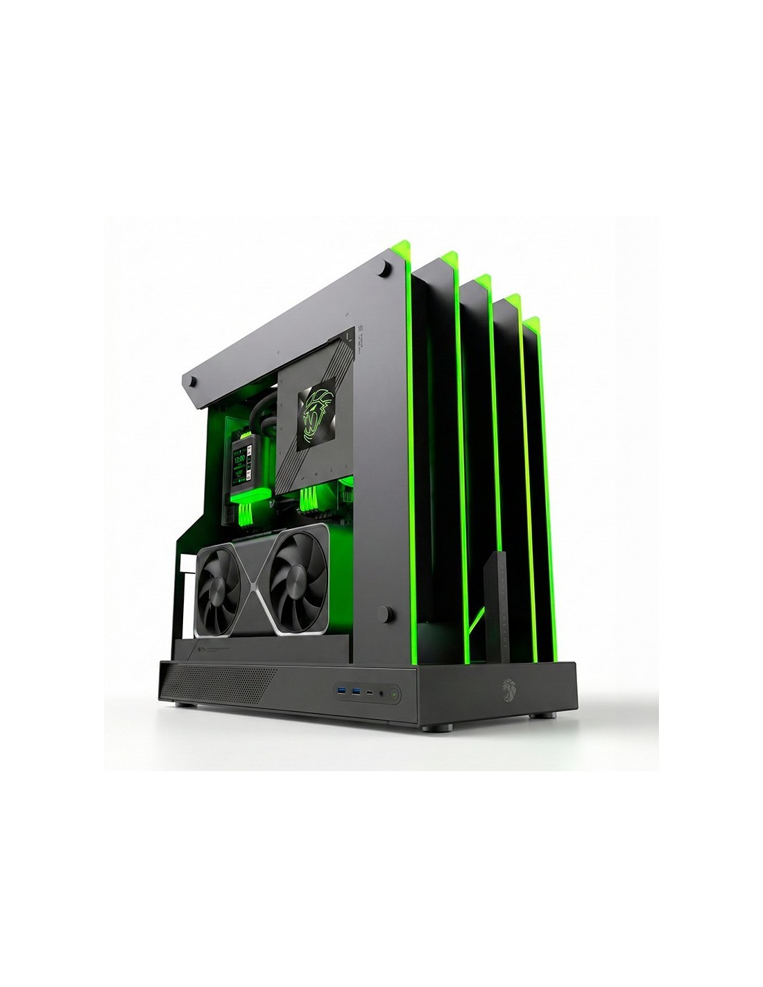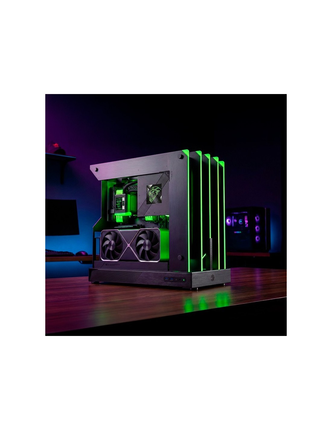 BLADE es una edición limitada que fusiona estética industrial y diseño gaming para un look brutal y exclusivo; su diseño open-air maximiza el flujo de aire y luce tus componentes desde cualquier ángulo, la iluminación RGB tipo garra aporta un impacto visual potente con un acabado metálico de gran precisión, y está preparada para montajes premium con GPU en vertical y un panel de conexiones moderno con USB-C.