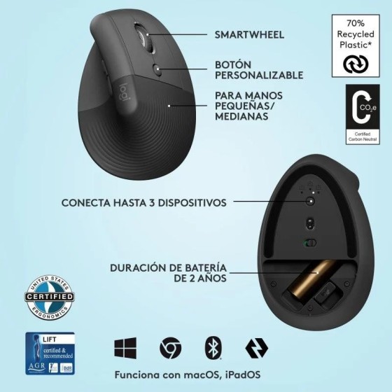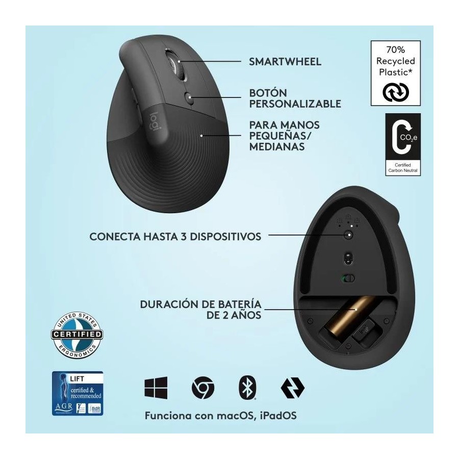 RATON LOGITECH LIFT VERTICAL WIRELESS ERGONOMIC 4000DPI 6 BOTONES BLACK